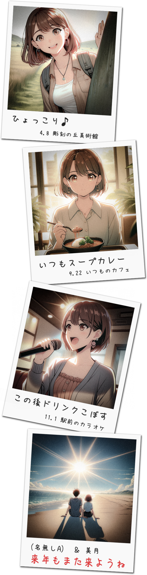 こんなの面と向かっては言えないけど、おれさ、あのころ本当にヨボみのことしか考えられないぐらい好きで。あんなに好きになれたのは後にも先にもヨボみだけなんだよな。だから、ヨボみには心から感謝してる。おれにとってのヨボみは、意地っ張りなのに嫌いになれなくて、話の内容が濃くて、おれの元カノへの嫉妬心が半端じゃなくて(笑)。美化しすぎかもしれないけど、おれにはお日様みたいに見えていたんだよ、ほんと。あとさ、デートで、ヨボみが行きたがったところにいろいろ行ったよな。近所の公園、スーパー、駅ビル…。なんか近所しか思い出せないけど(笑)、近所でも、何をしていても、この二人だからこそ楽しかったなって思うよ。